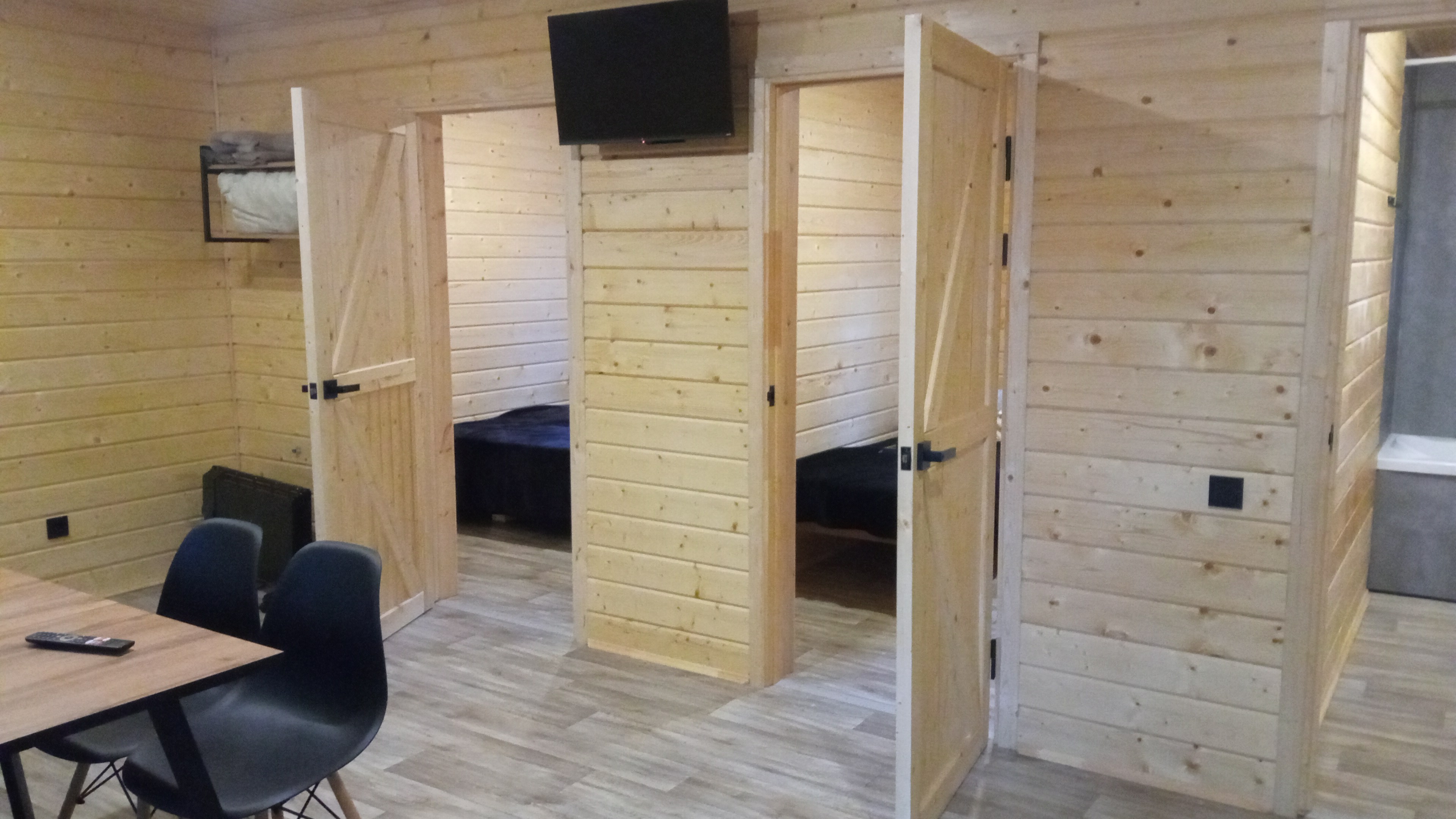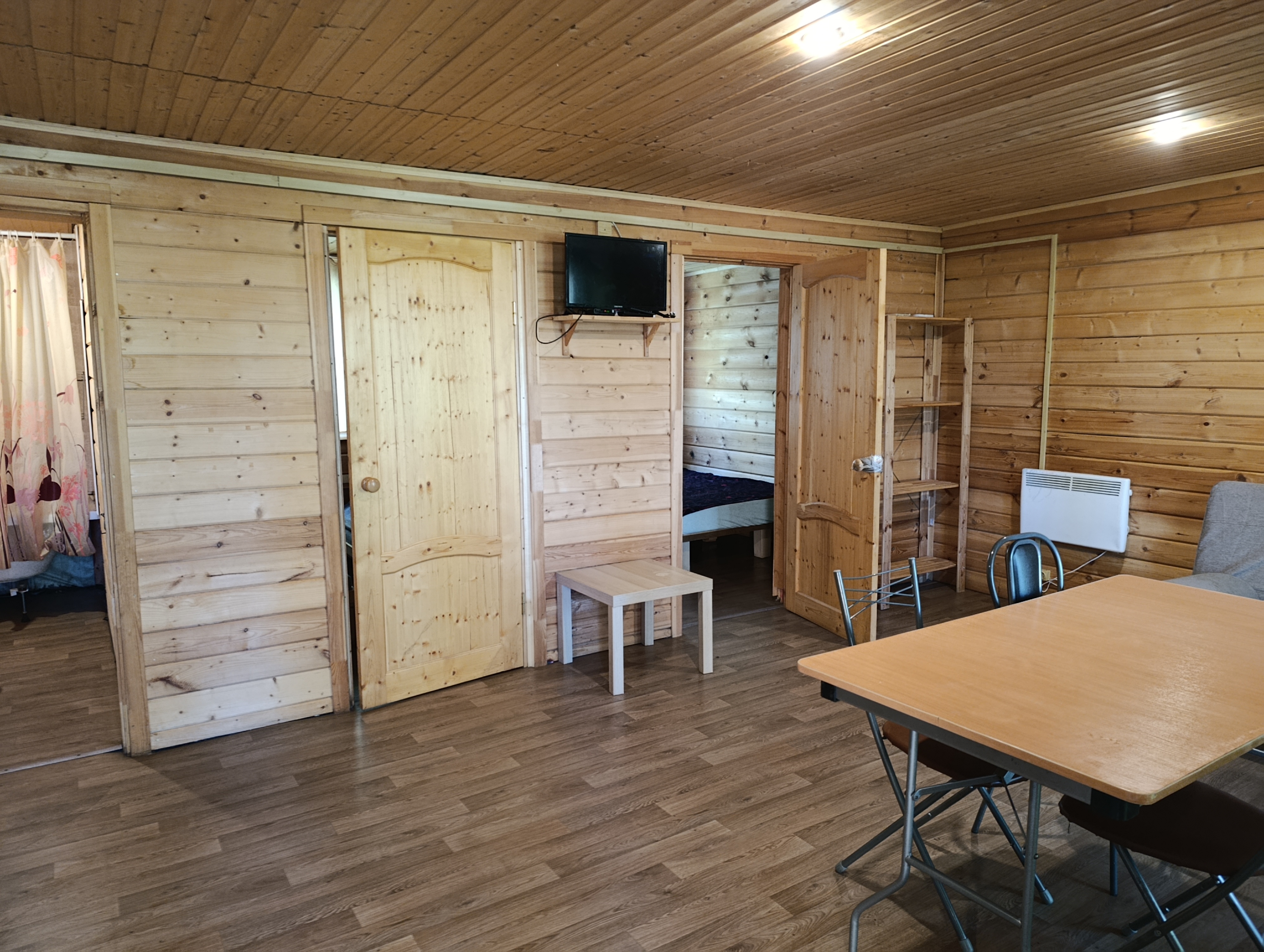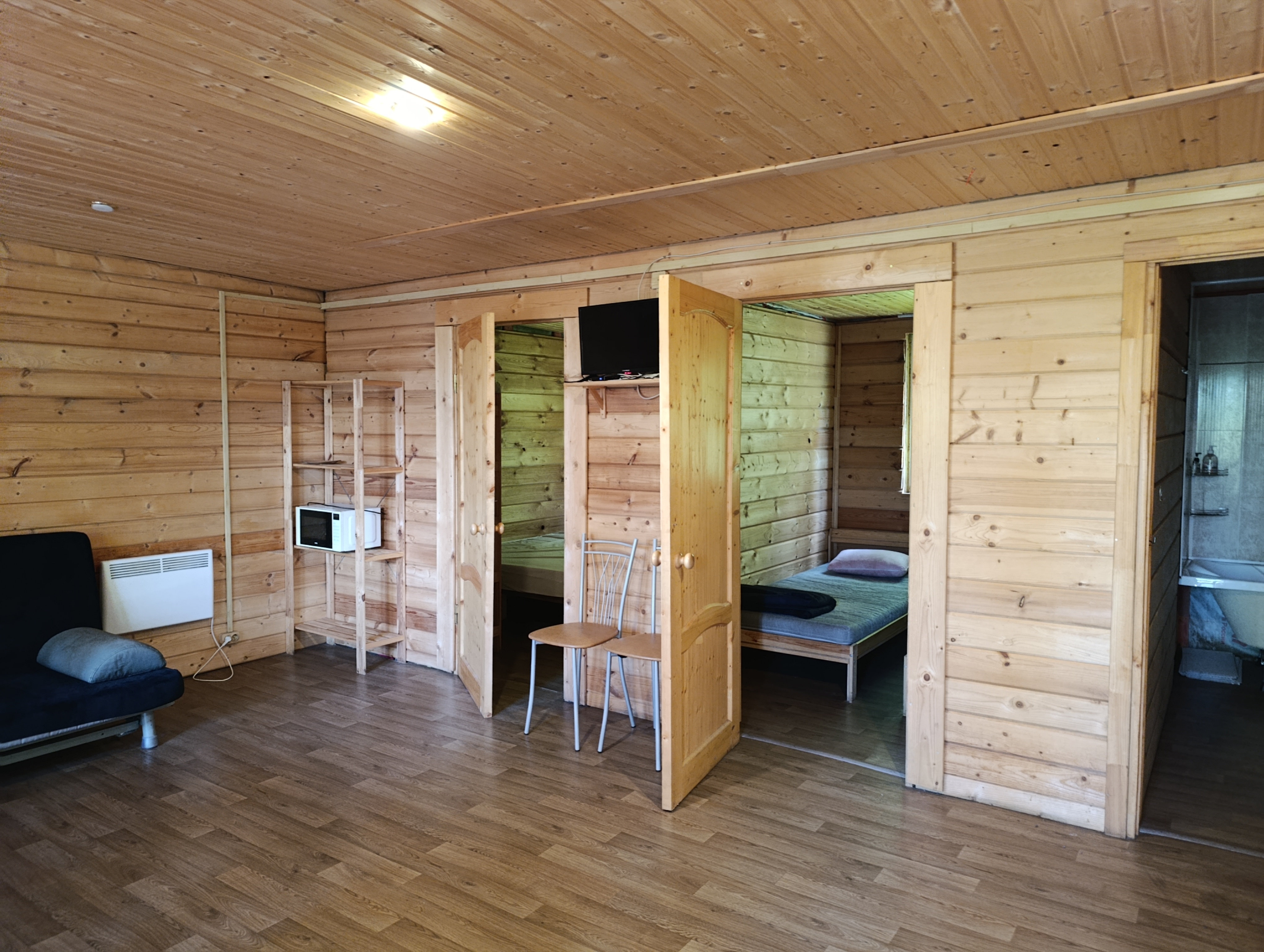 Общий просторный холл, в нем 2-х спальный диван. Две отдельные спальни. В одной 2-х спальная кровать. В другой 2 односпальные кровати стационарные. Телевизор- LED. Кухня с необходимой посудой, газовая плита, холодильник, санузел- душевая кабина, раковина, туалет. Коттедж оснащён электрообогревателями, дровяная печь.