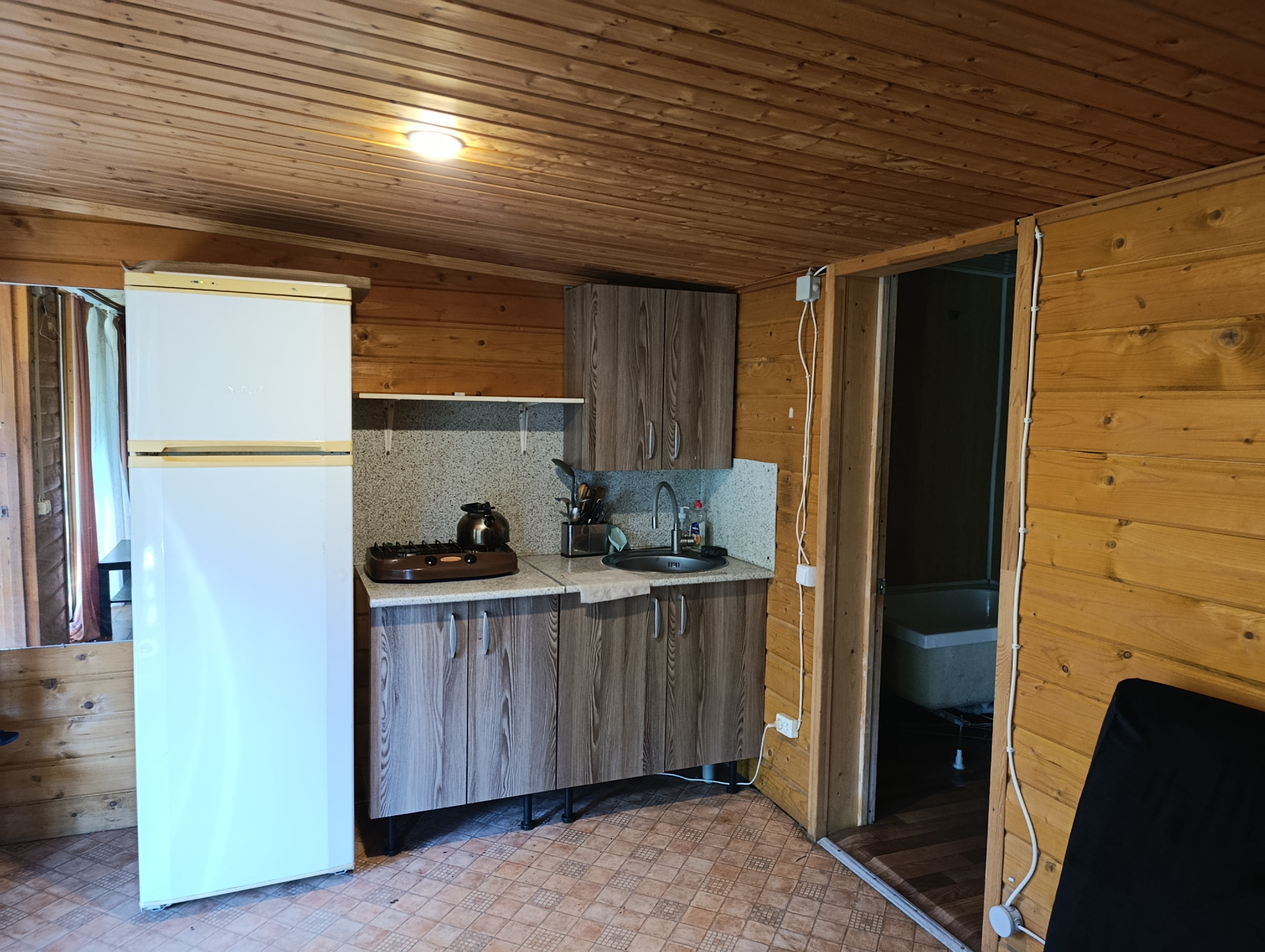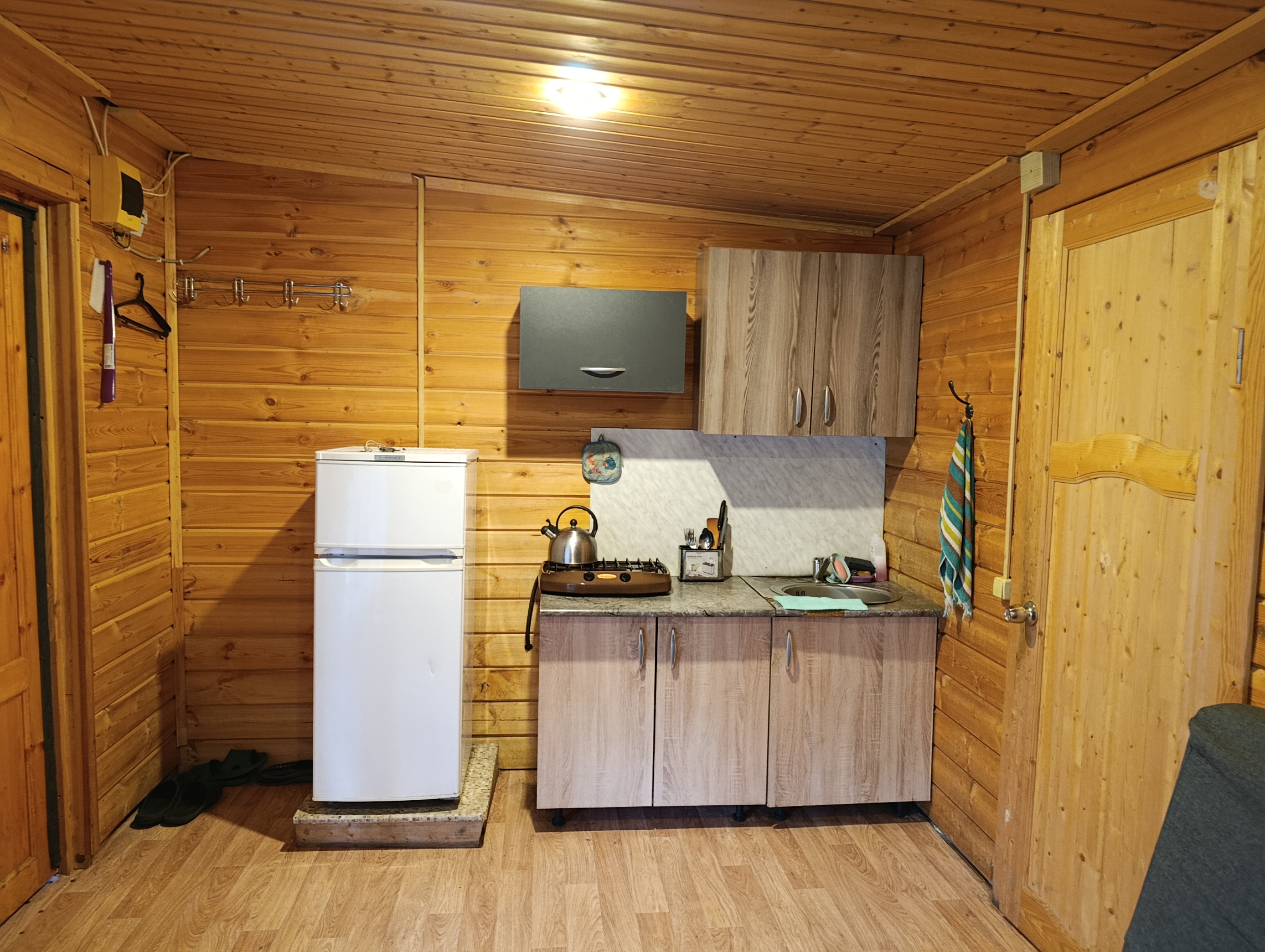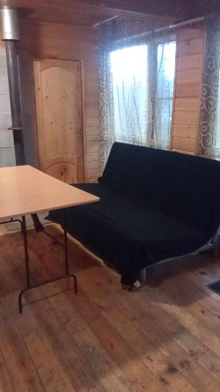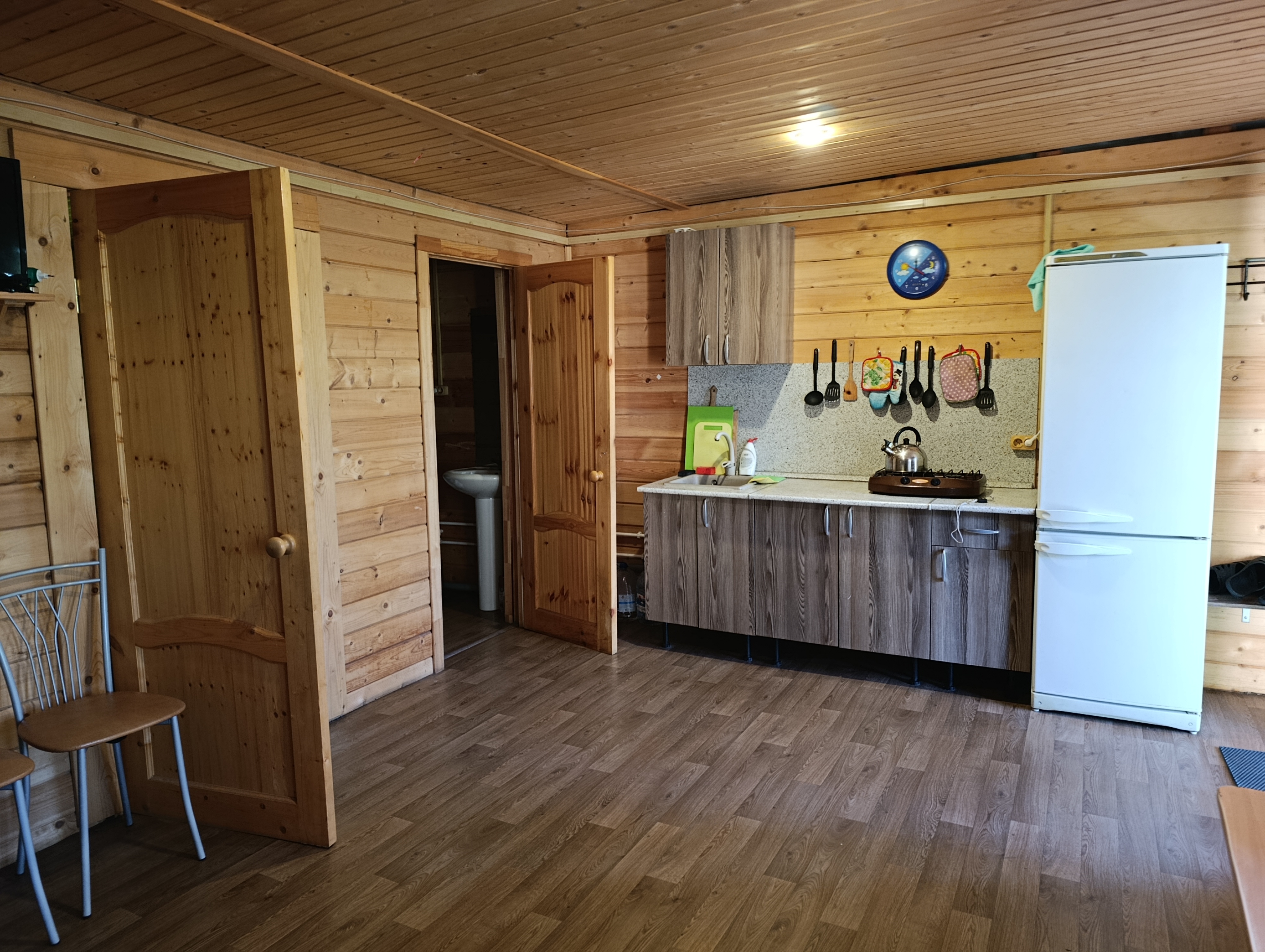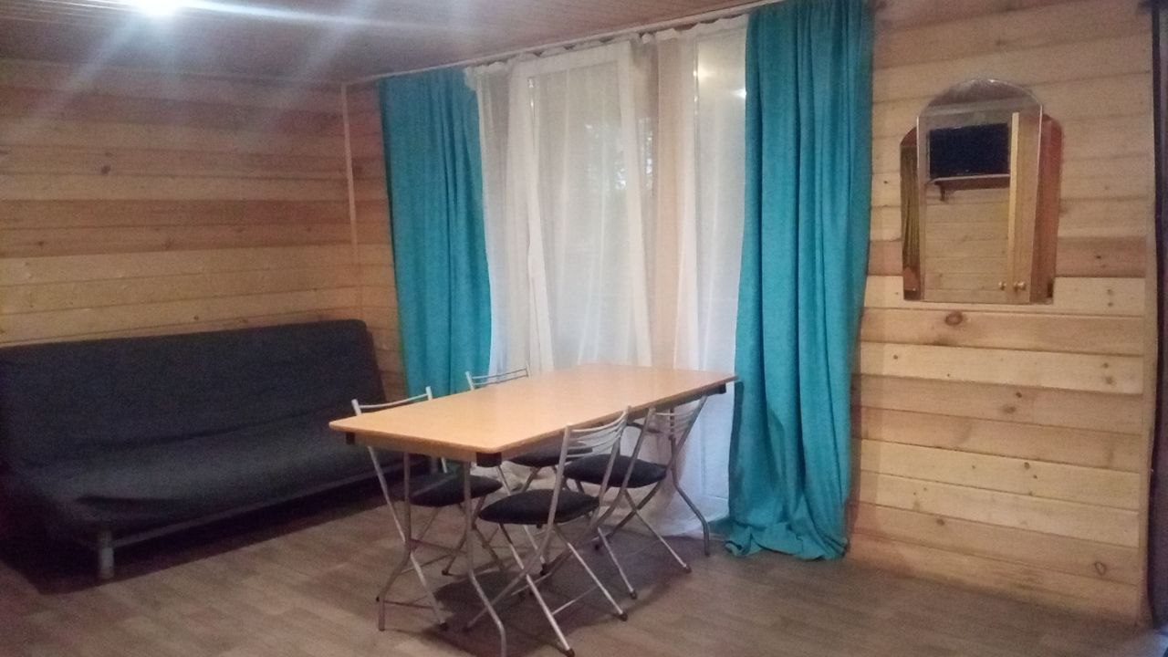Общий просторный холл, в нем 2-х спальный диван. Две отдельные спальни. В одной 2-х спальная кровать. В другой 2 односпальные кровати стационарные. Телевизор- Кухня с необходимой посудой, газовая плита, холодильник, санузел- душевая кабина, раковина, туалет. Коттедж оснащён электрообогревателями, дровяная печь.