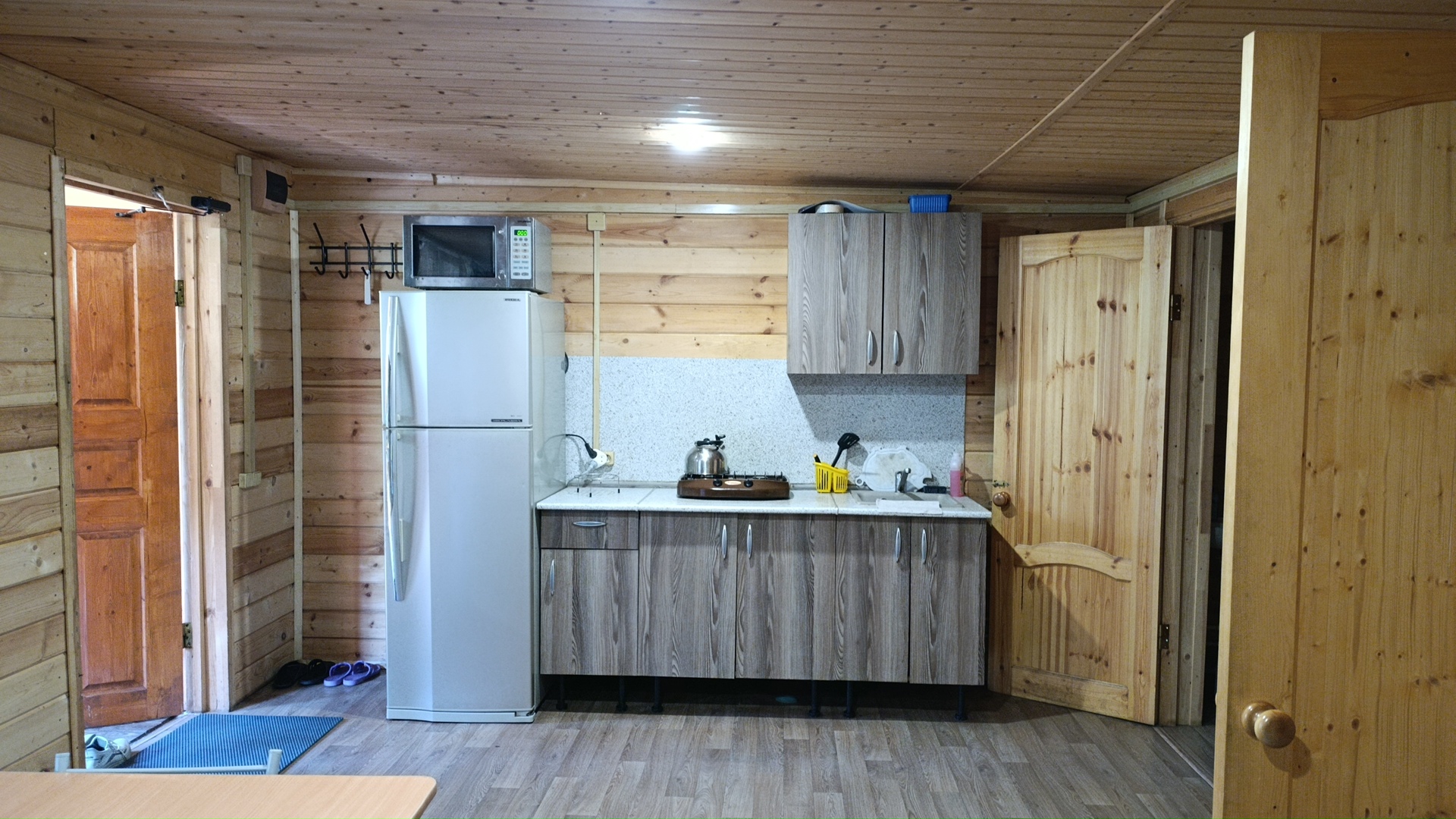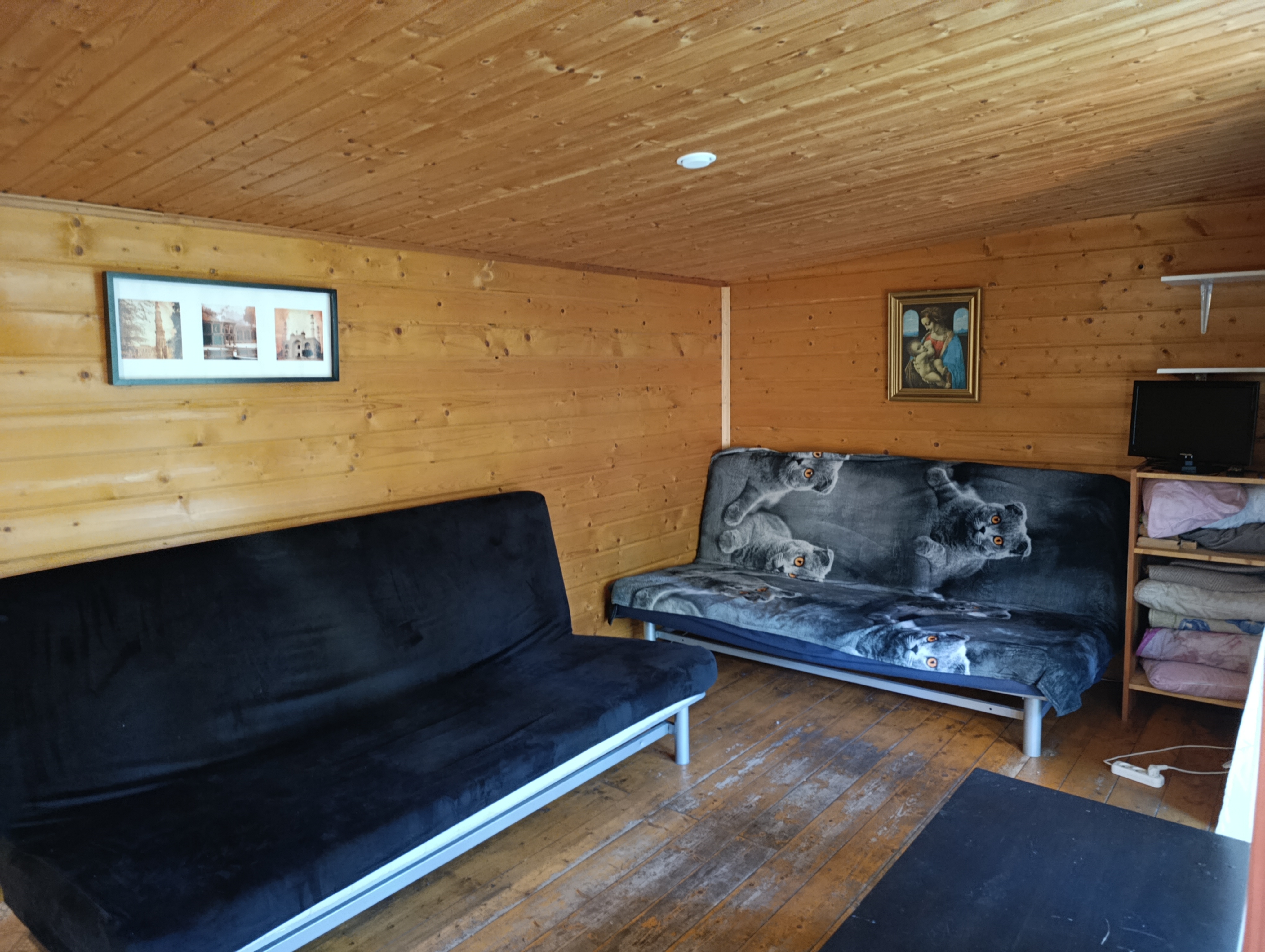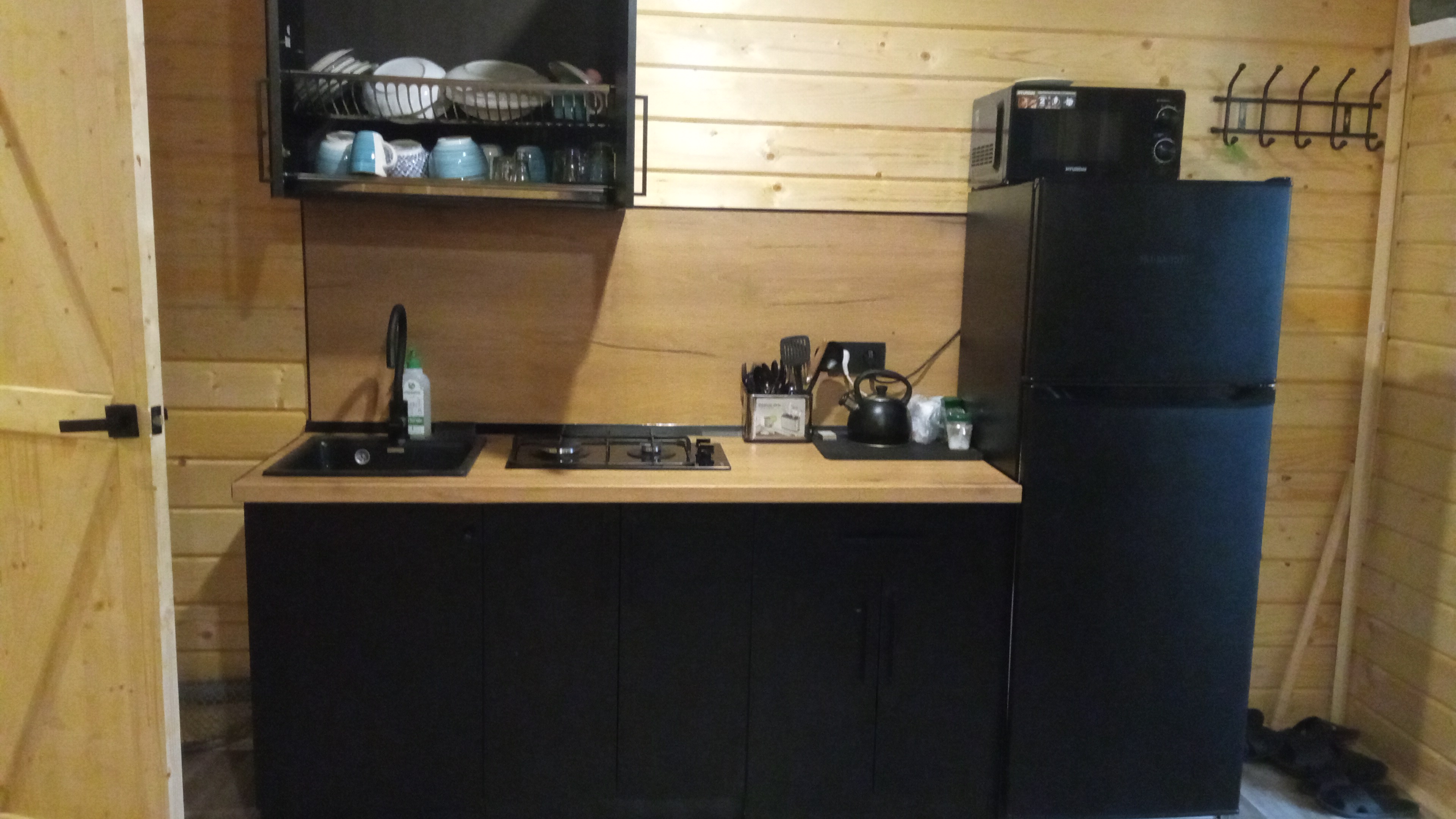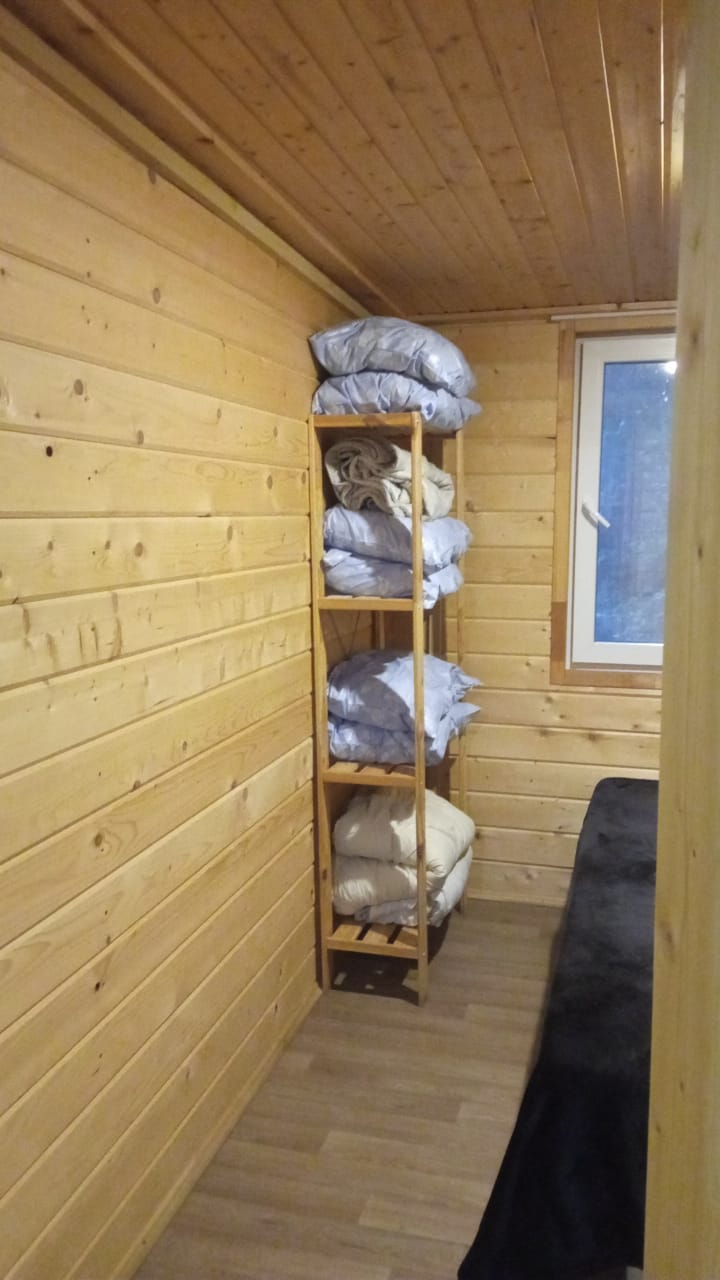 Общий просторный холл, в нем 2-х спальный диван. Две отдельные спальни. В одной 2-х спальная кровать. В другой 2 односпальные кровати стационарные. Телевизор- Кухня с необходимой посудой, газовая плита, холодильник, санузел- душевая кабина, раковина, туалет. Коттедж оснащён электрообогревателями, дровяная печь.